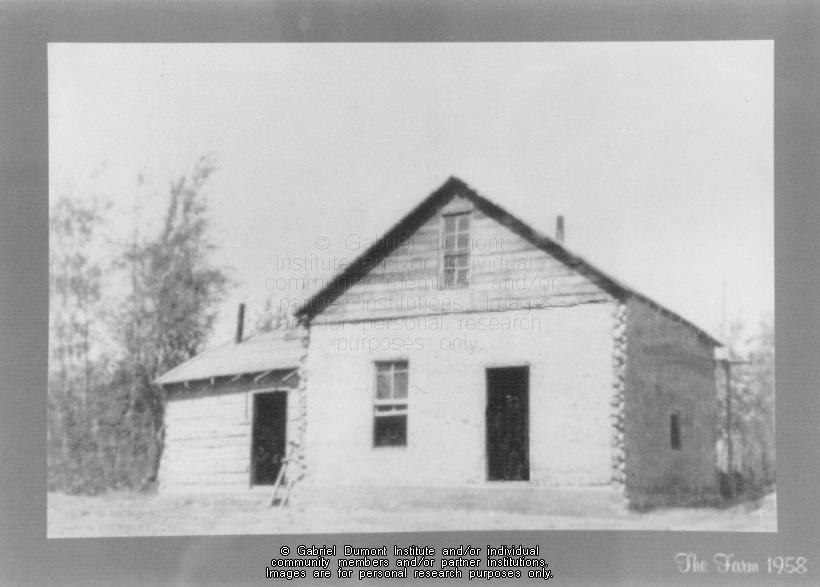 | Description: | Photograph of the Arcand family home in Debden Saskatchewan. It is a one and a half story log house with a shed and a ladder leaning up against it. |