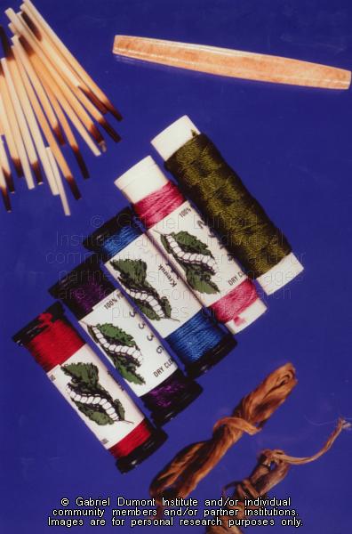 | Description: | Photograph of porcupine quills, a quill flattener, silk embroidery thread and sinew. These items belong to Sherry Farrell Racette. |