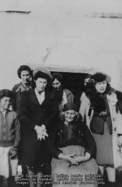 Photograph of a group of women posed outdoors, including Thérèse Bigault wearing a fur. The oldest woman is seated in a chair and the others are standing around her. Most of the women are wearing coats and skirts. |