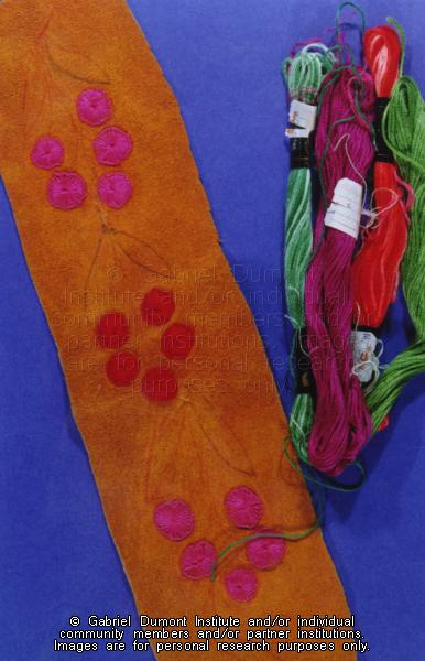 | Description: | Photograph of embroidery on hide created by Albertine Bouvier. This item belongs to the Bouvier family. |