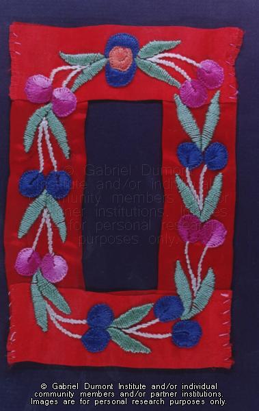 Description: Photograph of silk embroidery on silk ribbon created by Flora (Gardiner) Bouvier. Embroidered in a blanket stitch and satin stitch, this example of silk embroidery was used to frame a picture of Flora's younger brother Billy Gardiner, who died at a young age as a result of a hunting accident. This item belongs to the Bouvier family.