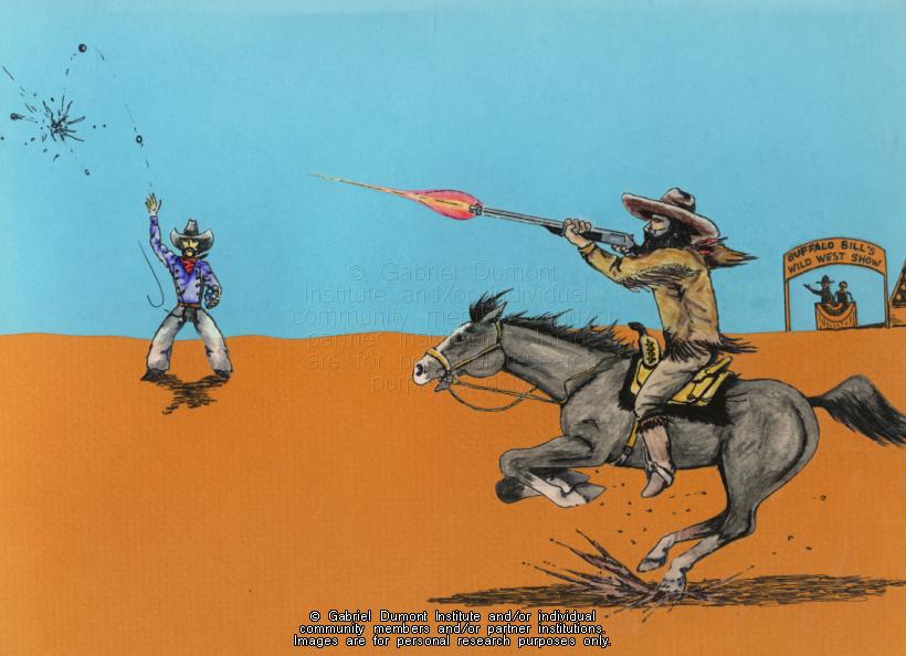 Illustration of Gabriel Dumont displaying his shooting talents while part of the Buffalo Bill's Wild West Show after fleeing Canada following 1885 Resistance from "Gabriel Dumont: Métis Legend". |