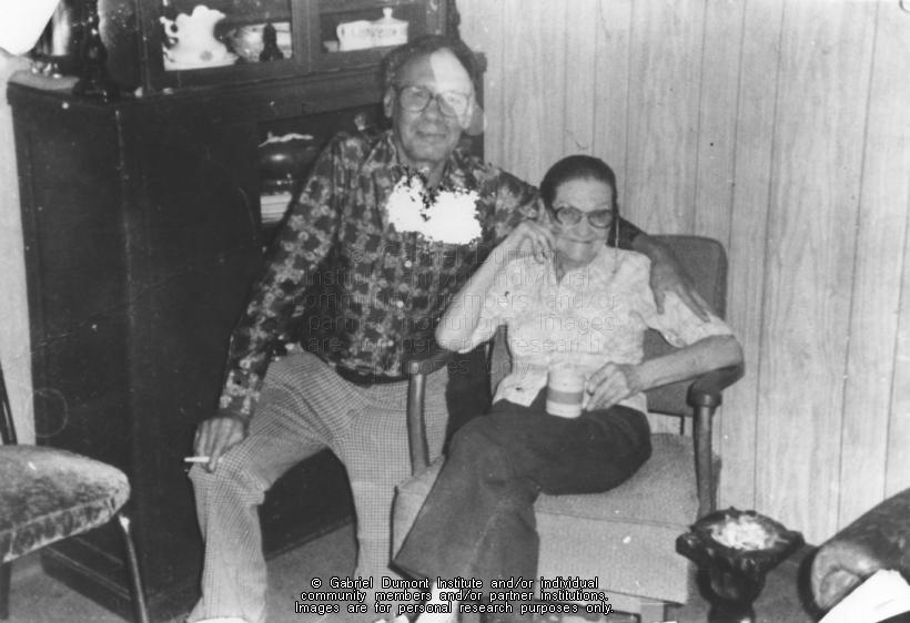 Photograph of Alec Pelletier and Eva Putnam taken indoors in someone’s living room. She is sitting in a chair holding a coffee cup and she is wearing dark pants and a light coloured blouse. Alec is kneeling beside her with his arm around her, and holding a cigarette. He is wearing chequered pants and a patterned shirt. Corrected information from Marie Peepeetch. |