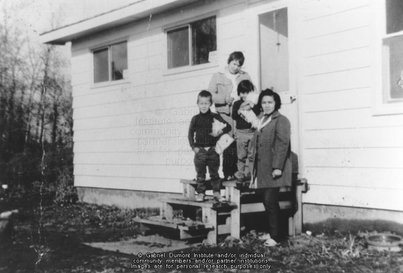 Photograph of a woman and three children on the steps of a house. The woman is standing beside the steps and is wearing a jacket, pants and some slip-on shoes. The two younger children on the steps are wearing dark coloured shirts and pants and they are holding stuffed animals that are white and fluffy. The older child is wearing a denim jacket and jeans. |