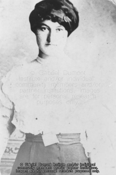 | Description: | Photograph of Mary Louise Loyie, wife of George Loyie, wearing a frilly white blouse, a dark coloured skirt, with a belt and some type of decorative buckle. She is also wearing something on her head, but it is unclear whether it is a hat or some kind of decoration worn in her hair. The photo was taken indoors, and her clothing appears to be from the early twentieth century. |