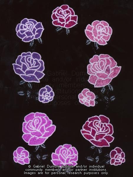 Photograph of beadwork created by Isabelle Impey (Dorion) of Cumberland House, Saskatchewan. Panel 7 of 10. This item is part of the Gabriel Dumont Institute Museum Collection. |