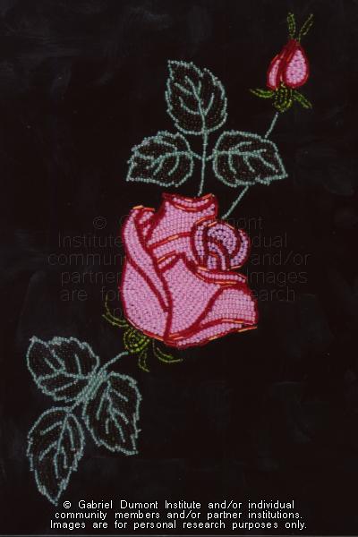 Photograph of beadwork created by Isabelle Impey (Dorion) of Cumberland House, Saskatchewan. Panel 4 and 5 of 5. This item is part of the Gabriel Dumont Institute Museum Collection. |