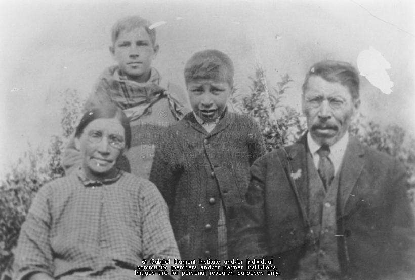 Photograph of Catherine (left), Antoine Pelletier (middle) and an unknown man and boy, one of which is possibly named Michael. The man and the woman appear to be sitting, while Antoine is standing between them and the other boy is standing behind them. The boys are wearing sweaters, Catherine is wearing a chequered dress, and the man is wearing a suit and tie. |