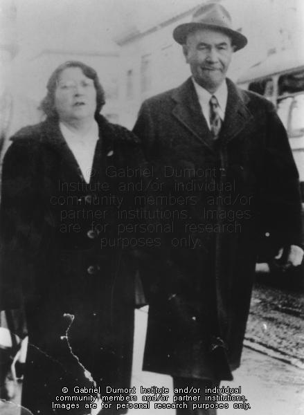 Photograph of Tom Sayer and Liza Pelletier walking down the street in Regina. There appears to be a bus in the background. They are both wearing heavy winter coats, he is wearing a hat and tie, and she is wearing a white blouse and carrying a purse. |
