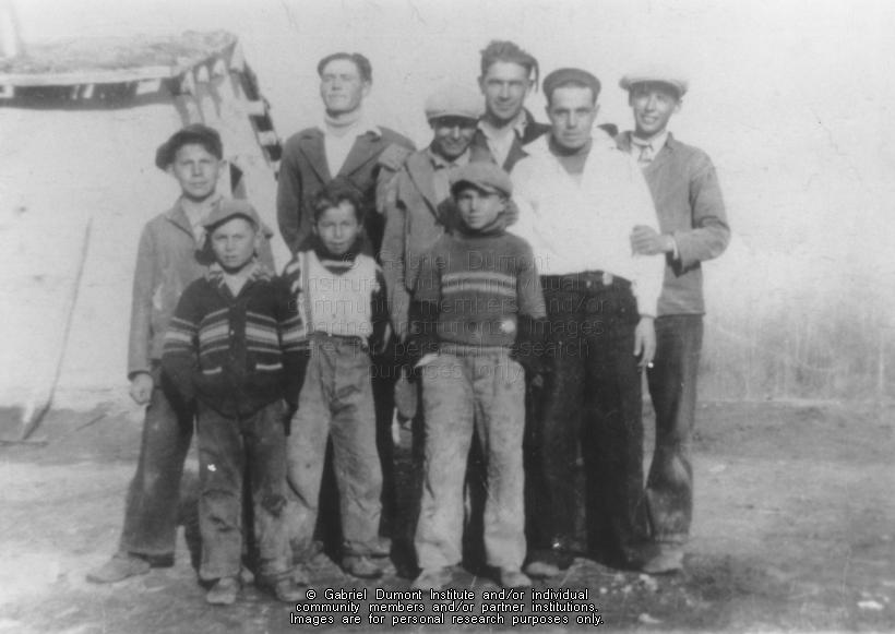 Photograph of a group of nine boys taken outdoors in front of a house. The man in the white shirt is Charley Pelletier. To the right of him with his hand on his arm is Mike Dufour. To the left of Charley in the back is Mike Pelletier. To the left of Mike is Garsoo Pelletier in the light coloured hat in the centre of the picture. The other man in the back, wearing the turtleneck and to the left of Garsoo is Ernest Lafontaine. The four younger boys in the front, from left to right, are Jack Lafontaine, Blacksmith Pelletier, and the other two are unknown. |