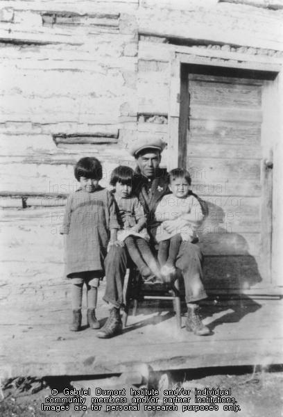 | Description: | Photograph of a Crooked Lake man with three children on the porch in front of a house. The man is sitting in a chair with two children in his lap, while the third older child stands beside them. The girl standing is wearing a plaid dress, and so is the girl next to her. The other child is wearing a white dress. The man is wearing work boots, pants, a jacket and a hat. |