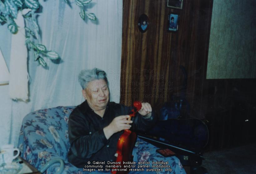 | Description: | Photograph of a an old man tuning a fiddle. He is sitting in an armchair indoors. |