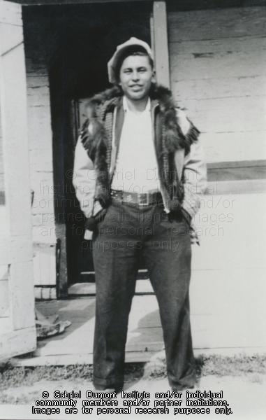 | Description: | Photograph of Danny Bouvier posed outdoors in front of a wood plank house. He is wearing pants, shirt, hat and a fancy fur trimmed and fringed coat. |