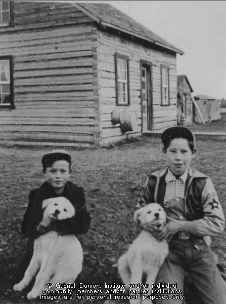Photograph of Richard Lafferty, on the left, and Eddie McLeod posed outdoors in front of a wood plank house. Richard is wearing a dark jacket and a hat, and Eddie is wearing jeans, a shirt, jacket and hat. They are each holding a dog. |