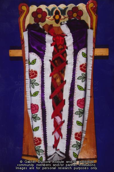 | Description: | Photograph of a beaded mossbag and cradleboard. The mossbag is made from manufactured white leather and purple velvet material. This item belongs to Leah Dorion. |