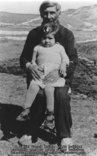 Photograph of Norbert Lavalley sitting with an unknown girl on his lap. They are sitting on a chair outdoors. Norbert is wearing a dark coloured shirt and pants and moccasins. The girl is wearing a light coloured dress. |