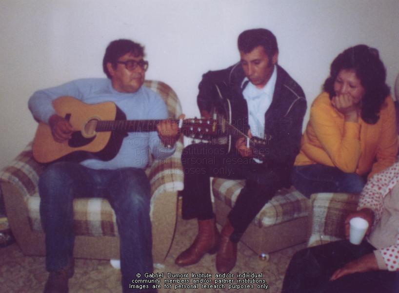 Photograph of Mervin Pelletier (centre) and a friend playing the guitar. There are people listening to them play, including a woman in a yellow sweater and jeans and someone in a red polka dot shirt. Mervin is wearing jeans and cowboy boots. |