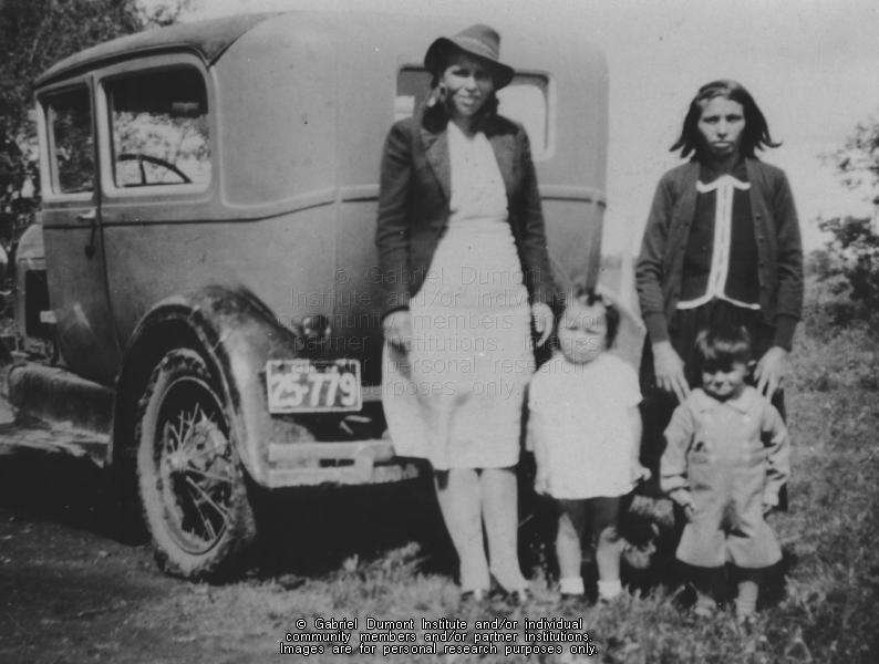 | Description: | Photograph of two women, one is quite young, and two small children. The older woman is wearing a dress with a jacket and a hat, and the younger woman is wearing a dress with a sweater. The vehicle has a visible licence plate number, 25-779. |
