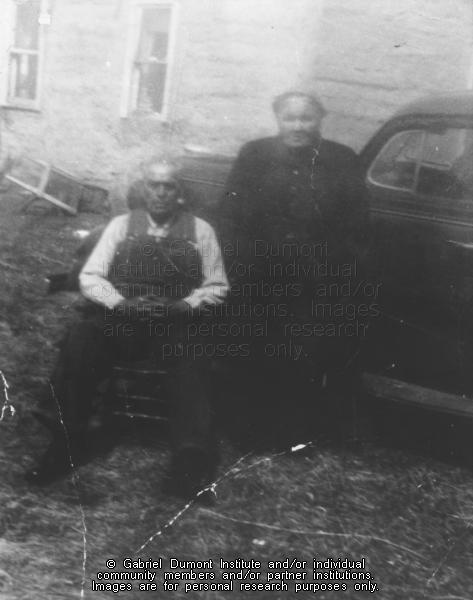 Photograph of Mary St. Pierreās parents. They are posed outside with her father wearing overalls and sitting in a wooden chair and her mother standing in front of a car. There is a house behind the car. |