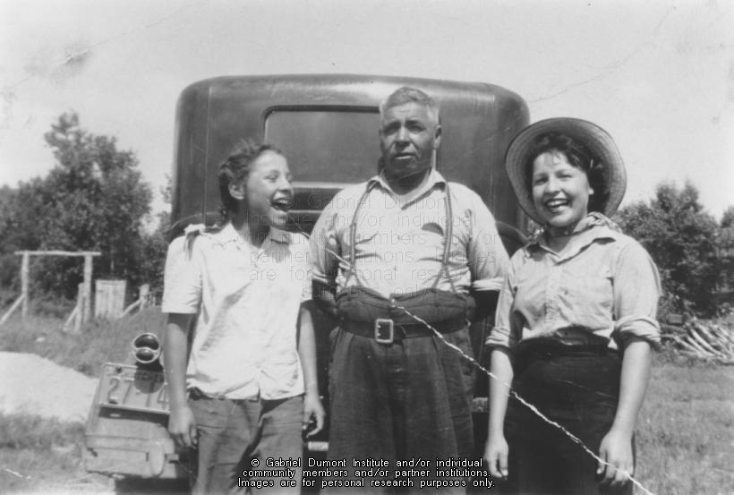 Photograph of Louis Pelletier and two girls posed outdoors in front of a car. The man is wearing a button-up shirt and pants with a belt and suspenders. The girl on the left has her hair in braids and is wearing a white blouse with pants. The girl on the right is older and she is wearing a straw hat, a scarf, a light coloured blouse and dark pants. |