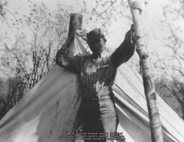 | Description: | Photograph of Edwin St. Pierre standing in front of a tent, holding onto a tree. He is wearing a plaid shirt, jeans and a hat. |