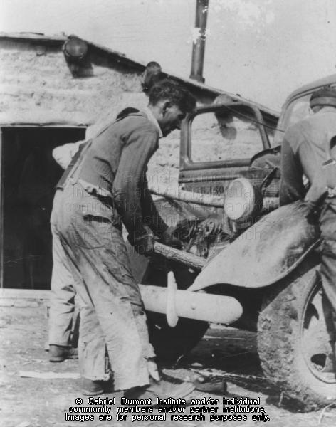 Photograph of several men working on the engine of a car. They appear to be using logs to lift the engine out of the vehicle. They are in front of a wooden house. |