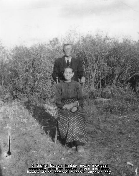 | Description: | Photograph of Billie Robison's grandparents, Veronica and Francois-Xavier Welsh. They are posed outdoors with Veronica sitting on a wooden chair and Francois is standing behind her. He is wearing a suit and tie, and she is wearing a dark blouse and a dark printed skirt. |