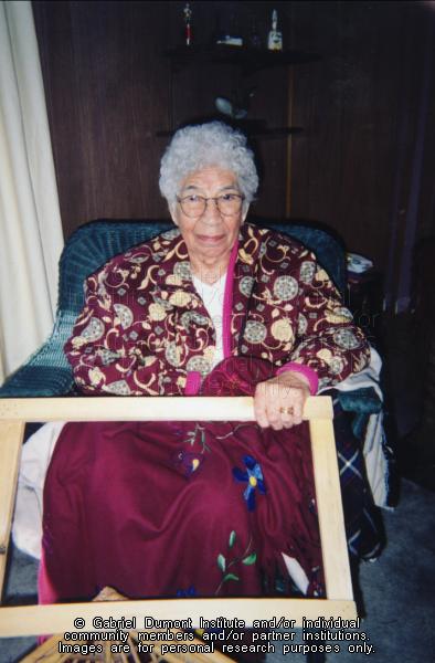 | Description: | Photograph of Adeline Pelletier dite Racette holding up a frame. |