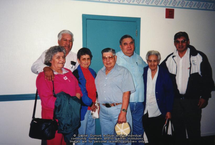 Photograph of Métis Elders and keepers of the Michif language, Gilbert and Mary Pelletier, Stella and Jim Lavalley and Edwin and Mary (his mother) St. Pierre. To the immediate right is an unknown gentleman. |