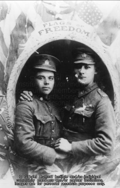 Description: Photograph of two cousins, Pte. Emelien Laliberte (left) and Pte. John Laliberte, in World War I military uniform. They are posed in a cut-out background depicting "flags of freedom" from several countries.