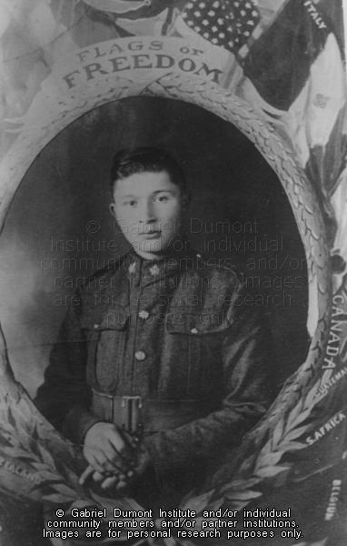 | Description: | Photograph of William Bourassa in World War I military uniform posed in a cut-out background depicting "flags of freedom" of several countries. |