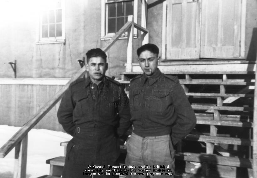 Photograph of Ralph Aubichon and J.B. (Chip) Ouellette posed in front of a set of wooden steps outside a building. They appear to be wearing World War II military uniforms. |