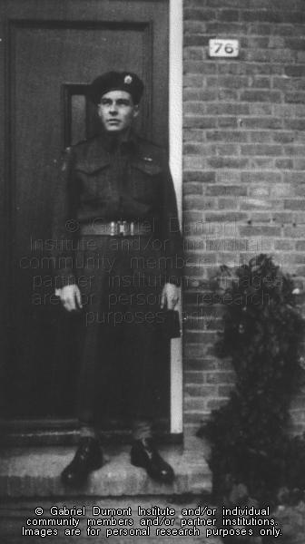 | Description: | Photograph of Pte. Lawrence Carey (L-91515) posed on the front step of a house. Lawrence enlisted on June 18, 1942 and was discharged December 10, 1945. He served with Fifth Field Ambulance in Italy as a driver. |