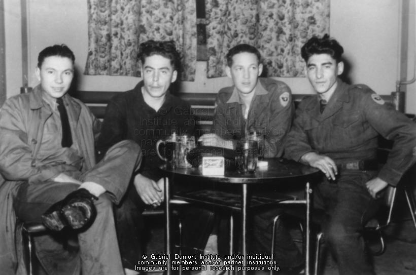 Photograph of (from left to right) of Peter Laliberte, Martin Aubichon, Stanley Laliberte and Ernest Aubichon – all from Green Lake, Saskatchewan. These men served in the Canadian Army, possibly in Korea, in the 1950s. |