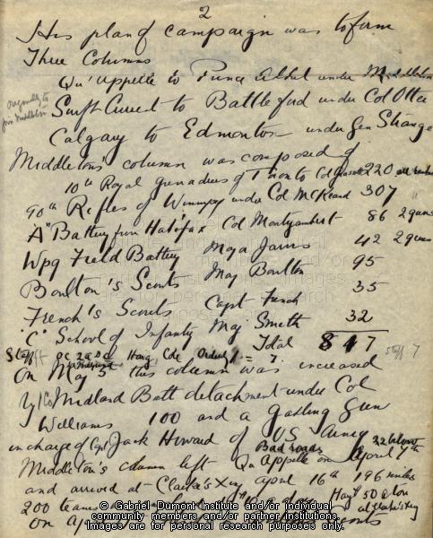 Lieutenant Colonel A.C.D. Pigott wrote this document entitled “Resumé of the Riel Rebellion” during various engagements of the 1885 Resistance. This is one of only a few first-hand accounts by any member of the Canadian army during the 1885 Resistance. Pigott chronicled the 1885 Resistance from the March 26, 1885 skirmish at Duck Lake to the campaign against First Nations warriors from Big Bear’s and Poundmaker’s camps. These pages focus largely on battling the First Nations and list troop movements and the advance of columns by Generals Otter and Strange. This document also contains a number of appendices, not numbered in sequential order, including a map of the Battle of Fish Creek and a second-hand transcription of a correspondence between Big Bear, General Middleton and Louis Riel. Page 2 of this document chronicles General Middleton’s strategy for quelling the 1885 Resistance and provides troop strengths of the various columns. This document, part of A.C.D. Pigott’s 1885 personal correspondence, is part of the A.C.D. Pigott Collection, which was acquired by the Gabriel Dumont Institute in October 1991 by the Ted Pappas family of Vancouver, British Columbia. The collection includes: Louis Riel’s English-French dictionary, Lieutenant Colonel Pigott’s 1885 Resistance battlefield manuscript, and a number of artifacts taken off the battlefield including: an inscribed watch, a pipe, a bullet maker and a buffalo powder horn (both from the Métis trenches), a carved wooden container taken from Big Bear’s camp, a First Nations decorative bracelet and horsehair braiding, which may have been traded for food by somebody captured by the Boulton’s Scouts. |