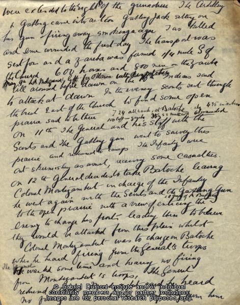 Lieutenant Colonel A.C.D. Pigott wrote this document entitled “Resumé of the Riel Rebellion” during various engagements of the 1885 Resistance. This is one of only a few first-hand accounts by any member of the Canadian army during the 1885 Resistance. Pigott chronicled the 1885 Resistance from the March 26, 1885 skirmish at Duck Lake to the campaign against First Nations warriors from Big Bear’s and Poundmaker’s camps. These pages focus largely on battling the First Nations and list troop movements and the advance of columns by Generals Otter and Strange. This document also contains a number of appendices, not numbered in sequential order, including a map of the Battle of Fish Creek and a second-hand transcription of a correspondence between Big Bear, General Middleton and Louis Riel. Page 6 of this document discuses how General Middleton’s forces barricaded the perimeters around Batoche starting on May 9, 1885 and the preparations neeed to take Batoche on May 12, 1885. This document, part of A.C.D. Pigott’s 1885 personal correspondence, is part of the A.C.D. Pigott Collection, which was acquired by the Gabriel Dumont Institute in October 1991 by the Ted Pappas family of Vancouver, British Columbia. The collection includes: Louis Riel’s English-French dictionary, Lieutenant Colonel Pigott’s 1885 Resistance battlefield manuscript, and a number of artifacts taken off the battlefield including: an inscribed watch, a pipe, a bullet maker and a buffalo powder horn (both from the Métis trenches), a carved wooden container taken from Big Bear’s camp, a First Nations decorative bracelet and horsehair braiding, which may have been traded for food by somebody captured by the Boulton’s Scouts. |
