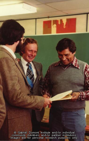 | Description: | Photograph of Jim Sinclair (in the grey sweater), then president of the Association of Métis and Non-Status Indians of Saskatchewan talking to a government official and Dr. Ken White, then the Executive Director of the Gabriel Dumont Institute. |