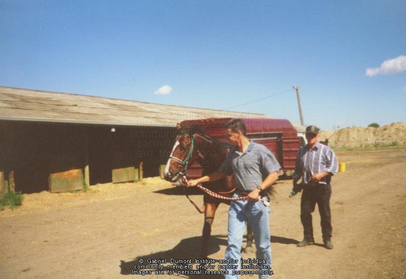 | Description: | Photgraph of Geordy McCaffre and another man leading a horse from the trailer to the stables. |