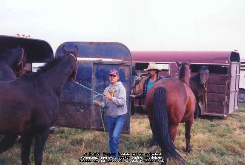 | Description: | Photograph of people loading up the horses into the trailers. |
