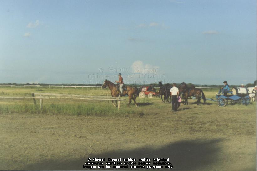 | Description: | Photograph of drivers preparing for a chuck wagon race. |