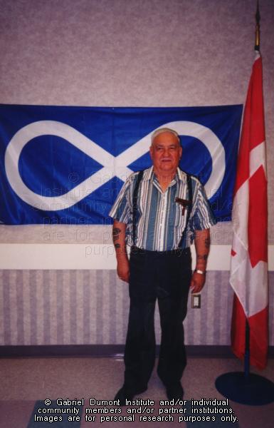 | Description: | Photograph of Cliff Hessdorfer, a Métis veteran in front of the Métis flag at the Prince Albert Metis Fall Festival in 1998. |