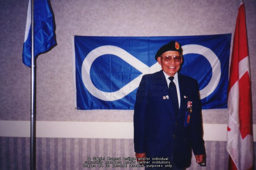 | Description: | Photograph of Norm Henderson, a Métis veteran in front of the Métis flag at the Prince Albert Metis Fall Festival in 1998. |