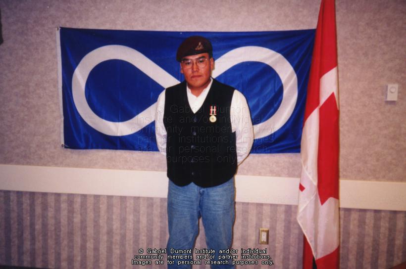 | Description: | Photograph of Claude Goulet, a Métis veteran, in front of the Métis flag at the Prince Albert Metis Fall Festival in 1998. |