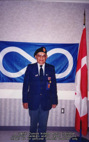 | Description: | Photograph of Norm Henderson, a Métis veteran in front of the Métis flag at the Prince Albert Metis Fall Festival in 1998. |