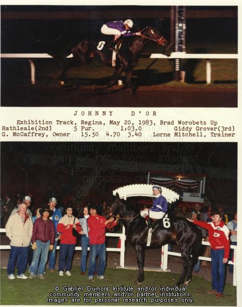| Description: | Photograph of Geordy McCaffrey's winning race horse "Johnny D'Or" ridden by Brad Worobetz at Exhibition Track, Regina, May 20, 1983. |