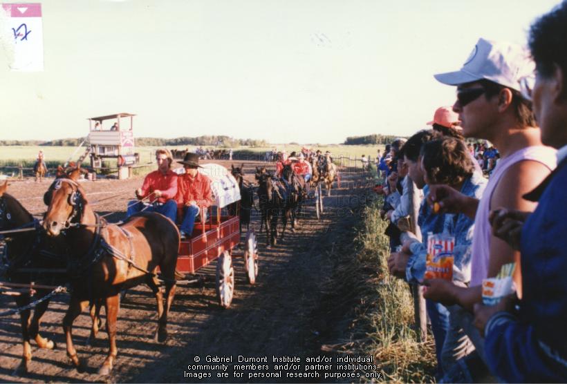 | Description: | Photograph of the chuck wagons doing a warm up lap as the crowd looks on. |