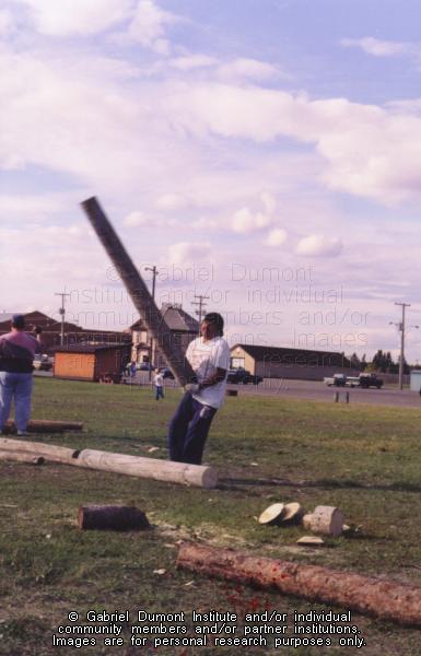 | Description: | Photograph of a man competing in the caber toss at the King Trapper Event at the Prince Albert Métis Fall Festival. |
