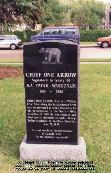 | Description: | Photograph of Chief One Arrow's (1810-1886) (Ka-Payak-Waskunam), signatory of treaty 6, headstone in St. Boniface. |