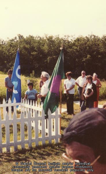 | Description: | Photograph of people attending a ceremony at the Batoche cemetery. |