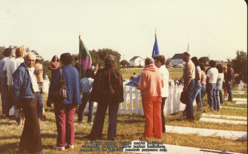 | Description: | Photograph of people attending a ceremony at the Batoche cemetery. |